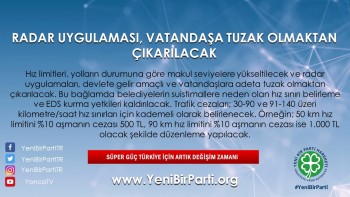 - Hız limitleri, yolların durumuna göre makul seviyelere yükseltilecek ve radar uygulamaları, devlete gelir amaçlı ve vatandaşlara adeta tuzak olmaktan çıkarılacaktır. Belediyelerin suistimallere neden olan hız sınırı belirleme ve EDS kurma yetkileri kaldırılacaktır. Trafik cezaları, 0-90 ve 91-140 üzeri kilometre/saat hız sınırları için kademeli olarak belirlenecektir. Örneğin; 50 km hız limitini %10 aşmanın cezası 500 TL, 90 km hız limitini %10 aşmanın cezası ise 1.000 TL olacak şekilde düzenleme yapılacaktır.