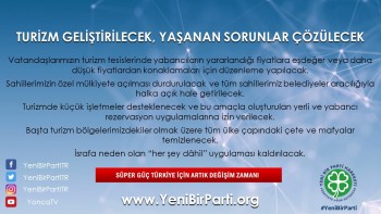 - Ülkemize olan turist ilgisini artırmak için dünya genelinde tanıtım kampanyaları ve reklamlar yapılacak, doğa ve inanç turizmini de içerecek şekilde ülkemizin tüm bölgelerinin turizme kazandırılması için altyapı yatırımları hızla gerçekleştirilecektir.
